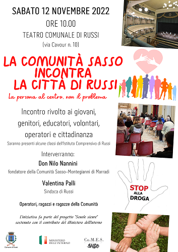 RUSSI (RA) – Sabato 12 novembre 2022, in occasione della 35^ edizione della Festa d’autunno, presso il Teatro Comunale di Russi, alle ore 10.00, si svolgerà un incontro con la Comunità Sasso-Monteggianni di Marradi, durante il quale sarà possibile ascoltare le testimonianze degli operatori, dei ragazzi e delle ragazze sulle dipendenze.