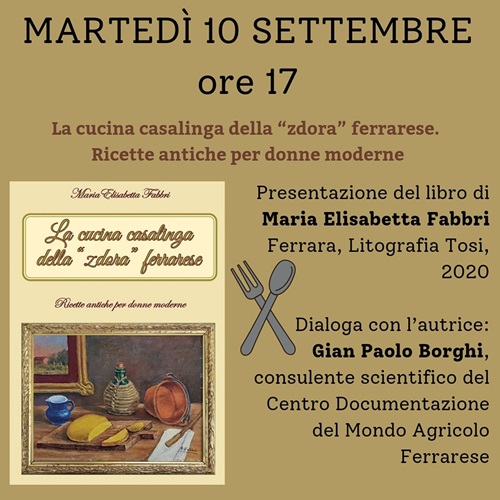 FERRARA – È una raccolta di “Ricette antiche per donne moderne” il libro di Maria Elisabetta Fabbri dal titolo “La cucina casalinga della ‘zdora’ ferrarese” (Ferrara, Litografia Tosi, 2020) che martedì 10 settembre 2024 alle 17 sarà presentato nella sala Agnelli della biblioteca comunale Ariostea (via Scienze 17 Ferrara). Dialogherà con l’autrice: Gian Paolo Borghi, consulente scientifico del Centro Documentazione del Mondo Agricolo Ferrarese