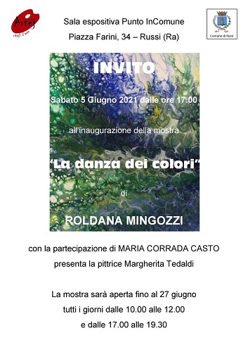 RUSSI (RA) – Sabato 5 giugno 2021 alle ore 17 presso sala Punto InComune, in piazza Farini 34 a Russi, verrà inaugurata la mostra personale dell’artista dell’Associazione Culturale “Artej – Ritagli d’Arte” Rolanda Mingozzi dal titolo “La danza dei colori”.