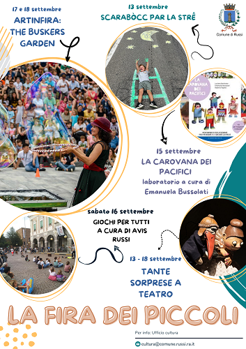 RUSSI (RA) – Anche quest’anno alla Fira di Sett Dulur i bambini e le bambine potranno scoprire un mondo fatto di giochi, laboratori, spettacoli e fantasia, grazie a una ricca programmazione pensata per loro dal 13 al 18 settembre. A conclusione di questo magico programma, due appuntamenti da non perdere con la musica, l’arte circense e l’abilità degli artisti di strada della rassegna “Artinfira: the buskers garden”, che allieterà il pubblico al giardino della Rocca “T. Melandri”.
