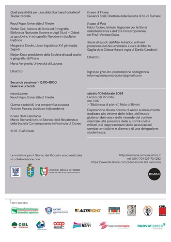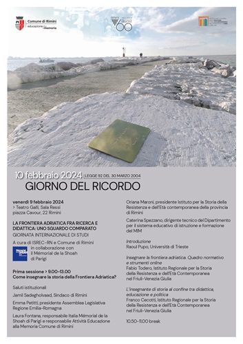 Quest’anno – dopo esattamente vent’anni dalla legge che ha istituito il “Giorno del Ricordo” – la scelta dell’Amministrazione è stata quella di organizzare una giornata di studi internazionale, che si svolgerà venerdì 9 febbraio, nella Sala Ressi del Teatro Galli, a partire dalle ore 9. Un momento di confronto e di formazione di alto livello dal titolo “La Frontiera Adriatica fra ricerca e didattica: uno sguardo comparato”, realizzato con il coordinamento scientifico del prof. Raoul Pupo, illustre studioso, e la partecipazione di studiosi italiani, sloveni e croati. L’iniziativa è curata dall’Istituto per la storia della Resistenza e dell’età contemporanea della provincia di Rimini, in collaborazione con il Comune di Rimini – Attività di educazione alla Memoria e la partecipazione dell’Unione degli Istriani – Libera Provincia dell’Istria in Esilio, del Comitato 10 febbraio, dell’Associazione Nazionale Venezia Giulia e Dalmazia.