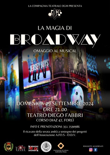 FORLÌ – La compagnia teatrale O.G.M. (Organismi Geneticamente Musicalizzati) è lieta di annunciare uno spettacolo unico: “La Magia di Broadway. Omaggio al musical”, che si terrà domenica 29 settembre 2024, alle ore 21.00, presso il Teatro Diego Fabbri di Forlì.