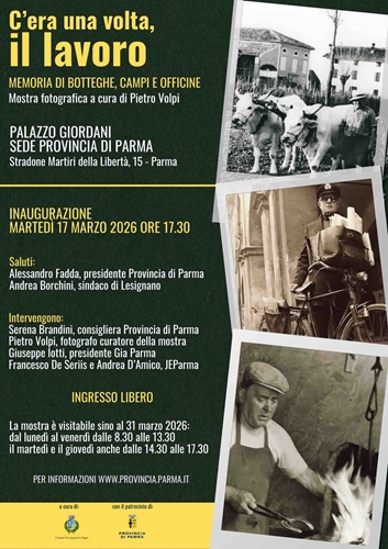Racconta tutto questo “C’era una volta, il lavoro. Memoria di botteghe, campi ed officine”, la mostra fotografica a cura di Pietro Volpi che sarà inaugurata martedì 17 marzo alle 17.30 nello Spazio ’51 di Palazzo Giordani, la sede della Provincia di Parma in Stradone Martiri della Libertà 15 a Parma grazie alla collaborazione tra il Comune diLesignano de’ Bagni, ente sostenitore dell’esposizione, affiancato dalla Provincia di Parma, che ha concesso il patrocinio.