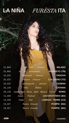 Dopo l’entusiasmo travolgente del tour indoor tra Europa e Italia, i numerosi sold out e la vittoria della prestigiosa Targa Tenco 2025 per il “Miglior Album in Dialetto”, LA NIÑA torna dal vivo con il “FURÈSTA ITA TOUR”. Un progetto che consolida la sua affermazione sulla scena musicale contemporanea e il legame profondo con il pubblico, portandola sui palchi dei più importanti festival estivi italiani.