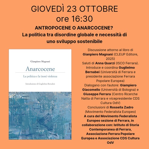 FERRARA – Avrà come tema “La politica tra disordine globale e necessità di uno sviluppo sostenibile” il dibattito ispirato dal libro di Gianpiero Magnani intitolato “Anarcocene – La politica della non violenza” in programma giovedì 23 ottobre 2025 alle 17:00 nella sala Agnelli della biblioteca comunale Ariostea (temporaneo ingresso da via Romiti 13, Ferrara).
