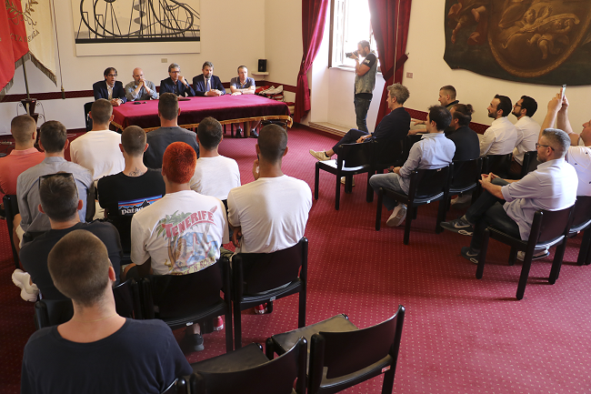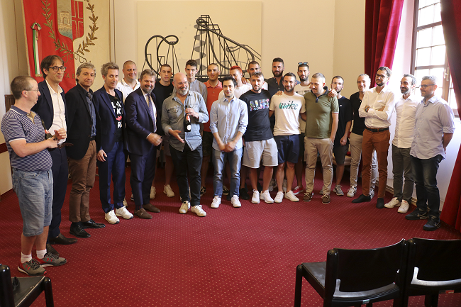 Durante il ricevimento, in cui erano presenti tutta la dirigenza e lo staf tecnico, gli atleti hanno consegnato nelle mani del Presidente e del Sindaco, due bottiglie celebrative della promozione. Un dono ricambiato con un kit contenete una t-shirt e altri gadget sportivi che il Sindaco e l’Assessore Brasini hanno dato ai ragazzi, con una targa in argento raffigurante il segno zodiacale della città, donata alla società e le medaglie del Bimillenario dell’Arco d’Augusto, consegnate a ciascuno dei dirigenti.