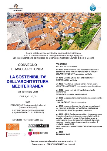 MILANO – All’interno degli eventi culturali proposti durante il prossimo Made Expo, fiera dell’edilizia aperta dal 21 al 25 novembre 2021 spicca un evento dal tema fortemente attuale: La sostenibilità dell’architettura mediterranea. Gli organizzatori sono Atena University e Edilsocialnetwork Academy.