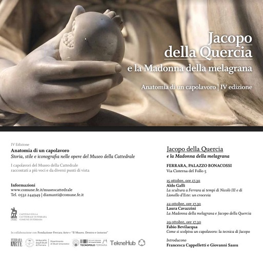 L’appuntamento, dal titolo Come si scolpiva un capolavoro: la tecnica di Jacopo della Quercia, è un’occasione culturale di grande fascino per gli appassionati: ospite è infatti uno dei più apprezzati restauratori italiani, Fabio Bevilacqua. Specializzato in restauro di materiali litoidi, Bevilacqua ha seguito importanti cantieri di restauro in qualità di restauratore e direttore tecnico come il Mausoleo di Teodorico a Ravenna, l’atrio della Abbazia di Pomposa, il Palazzo dei Diamanti a Ferrara. Ha restaurato i dipinti murali della Sala delle Sibille a Casa Romei e ha lavorato in Santa Maria in Vado intervenendo sia sui dipinti murali a olio su intonaco e sui grandi teleri dei soffitti di Carlo Bononi, Domenico Monio e Giulio Cromer. Per il Museo della Cattedrale della città estense ha eseguito importanti interventi conservativi e di pulitura sulle formelle duecentesche del Maestro dei Mesi e sulla stessa Madonna della melograna.