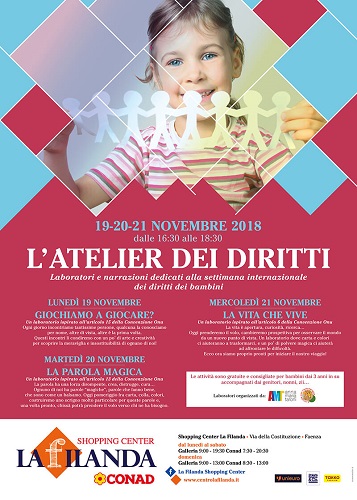 “L’atelier dei diritti” allo Shopping Center La Filanda: laboratori e narrazioni dedicati alla Settimana Internazionale dei diritti dei bambini. 19-20-21 novembre 2018 dalle ore 16.30 alle 18.30