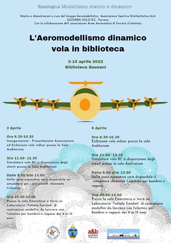 FERRARA – Dal 2 al 15 aprile 2022 l’aeromodellisimo sarà protagonista alla biblioteca comunale Bassani di via Grosoli 42 (zona Barco, Ferrara), con una mostra, dimostrazioni di volo e laboratori per bambini e ragazzi, a cura del Gruppo Aeromodellistico ‘Ala Azzurra’.