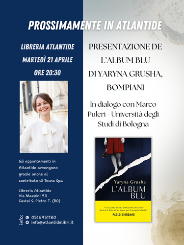 Martedì 21 aprile alle ore 20.30 la Libreria Atlantide di Castel S. Pietro Terme ospita la scrittrice, traduttrice e docente universitaria Yaryna Grusha per la presentazione del suo L’album blu (Bompiani). Dialogherà con l’autrice Marco Puleri, professore associato all’Università degli Studi di Bologna.