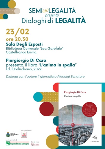 Il primo incontro, a ingresso libero e gratuito, è venerdì alle ore 20.30, presso la Biblioteca Comunale “Lea Garofalo”, in sala Gabriella Degli Esposti, con ospite Piergiorgio Di Cara, scrittore, sceneggiatore e Funzionario della Polizia di Stato di Palermo, che presenta il libro “L’anima in spalla” (Edizioni Il Palindromo, 2022).