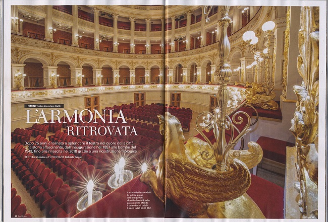 La prima parte del servizio firmato dalla giornalista Lara Leovino è dedicata a “L’armonia ritrovata” con la riapertura nell’ottobre del 2018 del Teatro Galli. Corredato dalle immagini scattate dal fotografo Gabriele Croppi, sfogliando le pagine si percorre un tour tra le sale del Teatro polettiano, di cui la giornalista ripercorre la travagliata storia, dall’apertura nel 1857 alla rinascita dopo 70 anni di silenzio nel 2018. La seconda parte del servizio è invece dedicata ai festeggiamenti per il secolo di Federico Fellini, presentando la mostra di Castel Sismondo e la prossima apertura del Museo Internazionale, oltre a raccontare il mondo onirico del Maestro attraverso le pagine del Libro dei Sogni custodito al Museo della Città e ai suggerimenti per un itinerario felliniano.