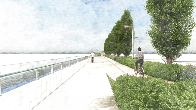 Verrà inoltre realizzata una fascia verde centrale che fungerà da separazione tra la strada e il nuovo percorso ciclo-pedonale. Questa fascia ospiterà un “giardino della pioggia” (rain garden), con la funzione di smaltire e filtrare le acque meteoriche. L’area verde complessiva aumenterà da 70 mq a circa 250 mq, con la piantagione di 15 nuove alberature e circa 700 nuove piante arbustive.