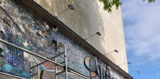 MODENA - I lavori di restauro del bassorilievo monumentale in ceramica posto sulla facciata dell'istituto Corni, sul lato che si...