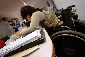 Foto: comunità papa giovanni XXIII, lavoratori portatori di handicap, telefonista, telefono, carrozzina, ufficio ©Riccardo Gallini_GRPhoto