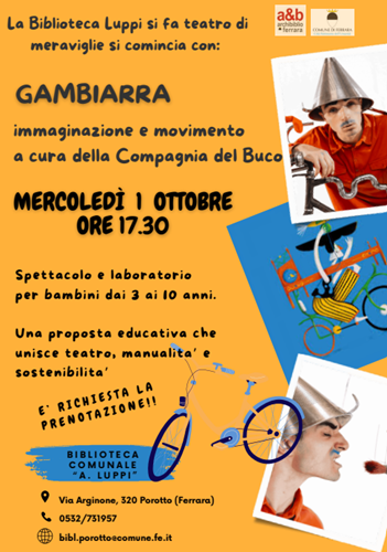 FERRARA – Sarà lo spettacolo teatrale “Gambiarra – Immaginazione in movimento” ad aprire, mercoledì 1 ottobre 2025 alle 17:30, la nuova stagione delle “Belle Storie” per bambini alla biblioteca comunale Aldo Luppi (via Arginone 320, Porotto, Ferrara). Lo spettacolo comico e poetico è ispirato all’omonimo libro illustrato di Bruno de Almeida.