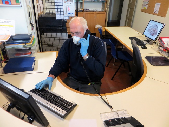 foto del desk della Biblioteca comunale di Palazzo Vendemini con uno degli operatori al lavoro