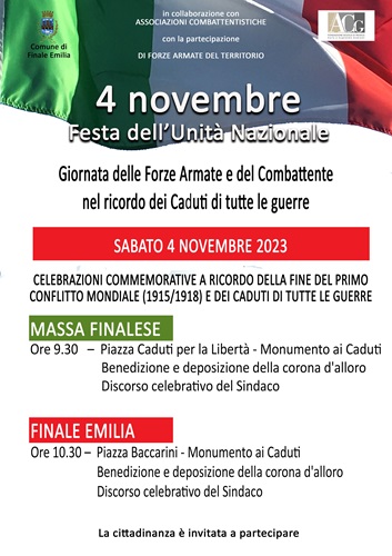 FINALE EMILIA – Sabato 4 novembre si terranno a Finale Emilia e Massa Finalese, le celebrazioni commemorative per la Festa dell’Unità Nazionale e della Giornata delle Forze Armate e del Combattente, a ricordo della fine della Prima Guerra Mondiale e dei caduti di tutte le guerre.