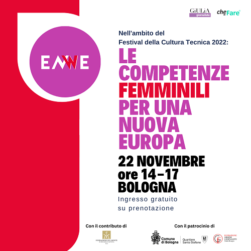 BOLOGNA – A tre anni dal lancio, la rete europea di database di esperte ENWE – European Network for Women Excellence organizza l’evento “Le competenze femminili per una nuova Europa” sulla visibilità delle donne nell’informazione, che si terrà martedì 22 novembre, dalle 14 alle 17, presso la Sala Marco Biagi in Via Santo Stefano 119 a Bologna, nell’ambito del Festival della Cultura Tecnica, con il contributo di Fondazione del Monte di Bologna e Ravenna e con il patrocinio del Comitato del Quartiere Santo Stefano di Bologna e della Fondazione Ordine dei Giornalisti dell’Emilia-Romagna.