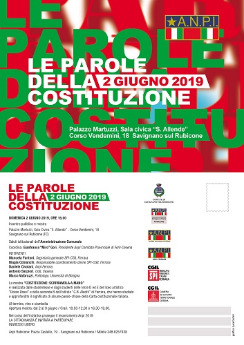 SAVIGNANO SUL RUBICONE (FC) – L’Anpi (Associazione Nazionale dei Partigiani d’Italia) sezione del Rubicone (che comprende i comuni di Gambettola, Gatteo, Longiano, San Mauro Pascoli e Savignano sul Rubicone), in collaborazione con ANPI Comitato provinciale Forlì-Cesena, ANPI Ferrara, CGIL SPI Ferrara, CGIL Cesena; e in occasione della festa della Repubblica Italiana organizza un incontro pubblico dal titolo Le parole della Costituzione, che si terrà domenica 2 Giugno 2019 alle 16 nel Palazzo Martuzzi, sala Allende a Savignano sul Rubicone (corso Vendemini 18). L’incontro avrà inizio con l’inaugurazione della mostra Costituzione: scriviamola a mano.