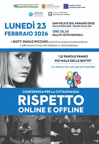 FINALE EMILIA (MO) – Un momento di confronto aperto alla cittadinanza per riflettere sul valore delle parole, sulle responsabilità educative e sull’impatto reale dei comportamenti digitali nella vita dei ragazzi e delle ragazze.Lunedì 23 febbraio 2026, alle ore 20.30, presso la Sala Consiliare di Piazza Italia 100 a San Felice sul Panaro, si terrà l’incontro pubblico “Rispetto online e offline”, una conferenza dedicata ai temi del bullismo e del cyberbullismo.