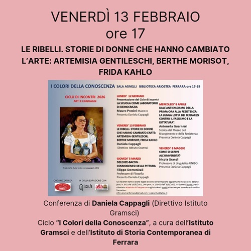 FERRARA – Ripercorrerà le “Storie di donne che hanno cambiato l’arte: Artemisia Gentileschi, Berthe Morisot, Frida Kahlo” la conferenza di Daniela Cappagli (Direttivo Istituto Gramsci) in programma venerdì 13 febbraio 2026 alle 17:00 nella sala Agnelli della biblioteca comunale Ariostea (via Scienze 17, Ferrara).