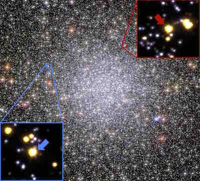 L’immagine in allegato evidenzia due delle stelle “pesate” dal team di ricercatori all’interno dell’ammasso 47 Tucanae. Nonostante siano indistinguibili in termini di luminosità e colore, la stella di sinistra ha una massa doppia di quella mostrata nel riquadro di destra. Le immagini delle stelle pesate è stata ottenuta dalla combinazione di tre esposizioni in filtri diversi, ottenute con il Telescopio Spaziale Hubble (credit: Cosmic-Lab/Ferraro/Dalessandro).
