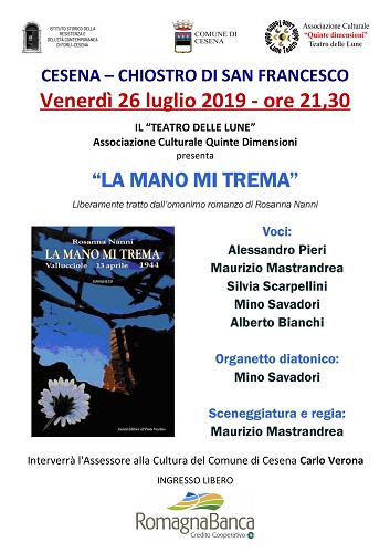 CESENA – Venerdì 26 luglio alle 21.30 al Chiostro di San Francesco andrà in scena lo spettacolo “La mano mi trema”, liberamente tratto dall’omonimo romanzo di Rosanna Nanni e curato da Il Teatro delle lune – Associazione Culturale “Quinte Dimensioni”. Ad introdurre lo spettacolo, che gode del patrocinio del Comune di Cesena, sarà l’Assessore alla Cultura Carlo Verona.