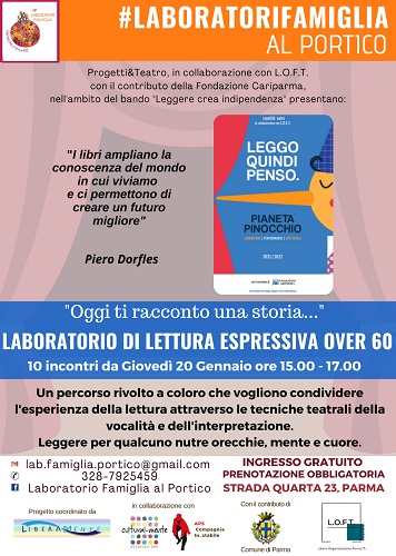 L’iniziativa intende coinvolgere in un percorso di educazione alla lettura e all’ascolto – improntato all’attraversamento del capolavoro di Collodi di cui si toccheranno i capitoli e le tematiche più salienti – tutte quelle persone over 60 che vogliano, altresì, esplorare e imparare a conoscere le tecniche teatrali della vocalità e dell’interpretazione. Leggere per qualcuno, rivolgersi a un interlocutore, rendere la narrazione un momento unico di condivisione e vita, è il filo conduttore dei 10 incontri che si svolgeranno, dopo il primo appuntamento introduttivo del 20 gennaio, ogni giovedì pomeriggio, dalle 15 alle 17, presso il centro “Al Portico” in Strada Quarta, n° 23, a Parma.