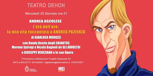BOLOGNA – Mercoledì 25 gennaio 2023 alle ore 21 si terrà il debutto nazionale del nuovo spettacolo di Andrea Ascolese tratto dal romanzo di Gianluca Morozzi “L’età dell’oro: la mia vita raccontata a Paz” al Teatro Dehon di Bologna.