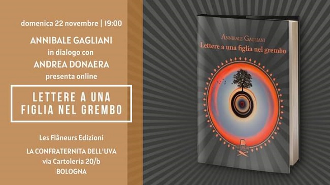 BOLOGNA – Sarà presentato domenica 22 novembre in streaming sulla pagina Facebook de La Confraternita dell’Uva di Bologna l’ultimo libro di Annibale Gagliani, dal titolo “Lettere a una figlia nel grembo” (Les Flâneurs Edizioni). Dialoga con lo scrittore Andrea Donaera. È possibile seguire l’evento, a partire dalle ore 19.00 al seguente link: https://www.facebook.com/La-confraternita-delluva-Libreria-Caf%C3%A8-Wine-Bar-224098721349631