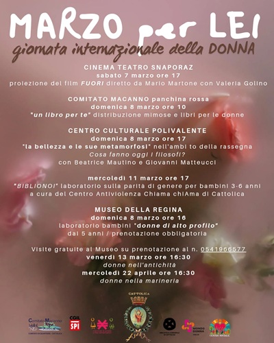 CATTOLICA (RN) – Libri, film, incontri e dialoghi filosofici e non, laboratori e visite al Museo. Tutto su un unico tema: la donna. Torna a Cattolica “Marzo per Lei“, il cartellone di eventi per il mese in cui si celebra la Giornata internazionale della donna, realizzato dall’Amministrazione comunale (Assessorato alle Pari opportunità) in collaborazione con il Cinema Teatro Snaporaz, il Centro Culturale Polivalente, il Museo della Regina, Mondo Donna Onlus e centro anti violenza ChiamaChiAma.“Anche quest’anno stiamo lavorando in modo concreto anche nel contesto culturale per continuare a fare passi avanti nelle pari opportunità e per portare in città iniziative che facciano riflettere – commenta l’Assessora alle pari opportunità Claudia Gabellini – Per questa edizione, accanto a eventi artistici abbiamo organizzato incontri per bambini e bambine sul tema della donna e della parità, stiamo organizzando anche cicli di incontri per la formazione al lavoro e stiamo lavorando al forum pari opportunità. Gli appuntamenti proposti sono organizzati anche in collaborazione con associazioni e comitati e si prefiggono di accompagnare le donne in un percorso di consapevolezza e autonomia, a partire dalla più giovane età”.