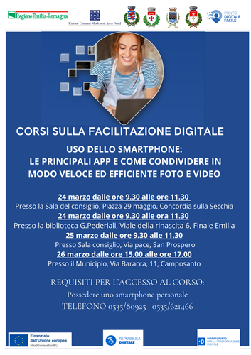 FINALE EMILIA (MO) – L’Unione Comuni Modenesi Area Nord, nell’ambito del programma Punto Digitale Facile finanziato dall’Unione Europea con i fondi NextGenerationEU, organizza una serie di incontri gratuiti dedicati a tutti i cittadini che vogliono sentirsi più a loro agio con la tecnologia.