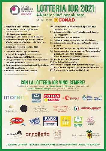 RUSSI (RA) – Il progresso nella lotta contro i tumori passa dalla ricerca. Per questo motivo l’intero ricavato della vendita dei biglietti della lotteria organizzata dallo IOR, Istituto Oncologico Romagnolo, con la collaborazione di Conad, verrà destinato alle attività di ricerca dell’IRST di Meldola. Ogni provincia della Romagna avrà un elenco di 22 premi esclusivo, ma soprattutto ricchissimo: il biglietto vincente più ambito sarà quello che darà diritto ad una nuova automobile. Anche i biglietti non vincenti diventano buono sconto di 2,50€, su una spesa minima di 20€ (dal 10/01 fino al 27/02) da utilizzare in tutti i punti vendita Conad della Romagna.