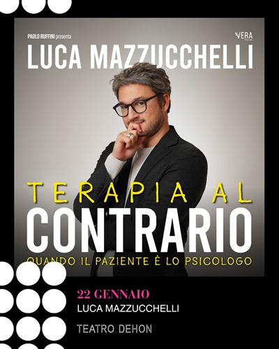 Al Teatro Dehon di Bologna giovedì 22 gennaio ore 21.00 in scena lo psicologo e divulgatore Luca Mazzucchelli in “Terapia al contrario“, uno spettacolo prodotto da Vera Produzione in cui il sarà terapeuta a vestire i panni del paziente.
