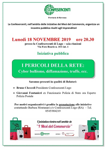 LUGO (RA) – Lunedì 18 novembre presso la sala riunioni della Confesercenti di Lugo in Via Foro Boario 4/1 alle ore 20.30 si terrà un incontro sul tema dei rischi in rete (cyber bullismo, diffamazione, truffe, ecc.) a cura di Giovanni Fontanieri, ex funzionario della Polizia di Stato ora esperto in Polizia Postale.