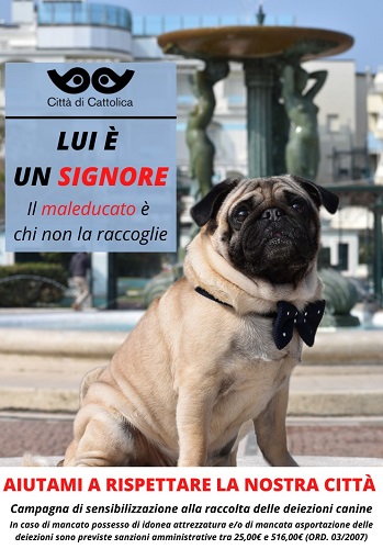 CATTOLICA (RN) – “Lui è un signore. Il maleducato è chi non la raccoglie”. Il Comune di Cattolica lancia una campagna di sensibilizzazione alla raccolta delle deiezioni canine. “Aiutami a rispettare la nostra città” è l’invito che Carletto, il carlino cattolichino, rivolge a tutti coloro che portano a spasso per le vie della città i propri amici pelosetti a quattro zampe.