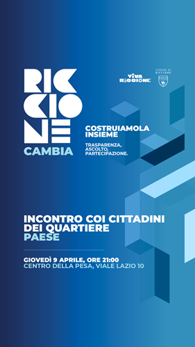 RICCIONE (RN) – L’ultimo appuntamento del viaggio nei quartieri farà tappa domani, giovedì 9 aprile, a Riccione Paese. Alle 21 presso il Centro della Pesa (viale Lazio, 10), la sindaca Daniela Angelini e la Giunta comunale incontreranno i cittadini per illustrare lo stato dei lavori pubblici, i cantieri in corso e i progetti che interesseranno la città. L’appuntamento con i cittadini fa parte del ciclo di incontri “Riccione cambia. Cambiamola insieme” promosso dall’amministrazione comunale: un percorso significativo per la città fatto di dialogo, condivisione e partecipazione della comunità per costruire insieme la Riccione del domani.