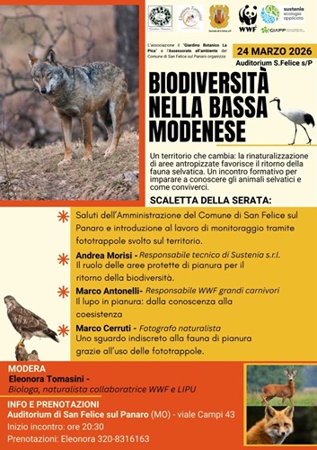 Il primo appuntamento è in programma martedì 24 marzo alle ore 20.30 presso l’Auditorium di San Felice sul Panaro, con l’incontro “Biodiversità nella Bassa Modenese”, dedicato al tema più ampio del ritorno della fauna selvatica e della rinaturalizzazione del territorio, con il contributo di esperti e tecnici del settore, promosso dal Giardino Botanico La Pica e il Comune di San Felice sul Panaro.