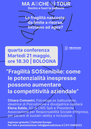 BOLOGNA – Dopo il successo di Bari, Padova e Roma, continua il “Ma Anche Sì Tour. Dentro e Fuori la Balbuzie” organizzato da Psicodizione, e farà tappa a Bologna, Zanhotel Europa, Via Cesare Boldrini, 11. Un viaggio che vuole informare, sostenere ed esortare all’azione. Un cammino attraverso la presa di consapevolezza e la condivisione delle esperienze di chi, direttamente o indirettamente, vive una fragilità più o meno nascosta.