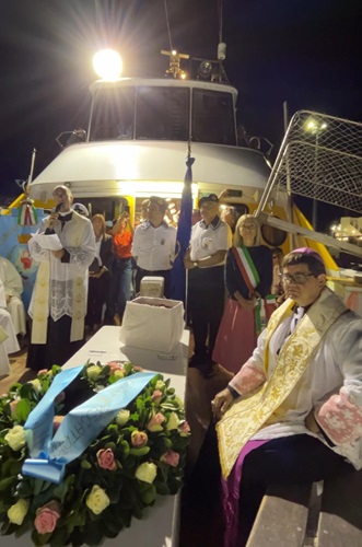 Sulle note delle musiche tradizionali dei marinai, la statua della Madonna è stata imbarcata sul San Lazzaro III, seguita dalla motonave Queen Elisebeth in cui hanno preso posto autorità civili, religiose, militari, cittadini e turisti. Una volta al largo, è stata lanciata la corona di fiori per commemorare i marinai caduti in mare. Rientrati al porto, la Statua è stata sbarcata e posizionata sull’altare allestito sulla banchina dove è stata celebrata la messa.