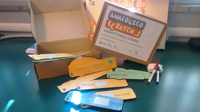 Analogico Scratch Kit è composto da tesserine colorate per l’insegnamento del coding, un manuale di presentazione del progetto, con proposte di esercizi e link a video informativi e semplici tutorial per insegnanti ed alunni. Il kit è stato realizzato in collaborazione con Eva Pigliapoco e Ivan Sciapeconi, insegnanti di scuola primarie ed esperti di Analogico Scratch e la Palestra digitale MakeitModena (via Barchetta 77, Modena) del Comune di Modena dove potrà essere utilizzato il carnet di tre ore di formazione all’uso del kit.