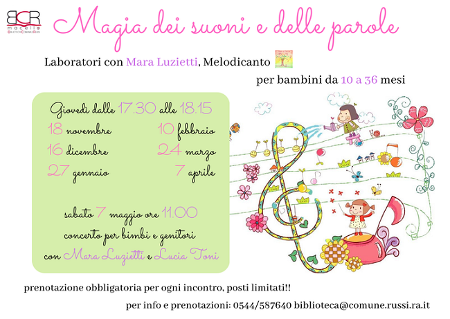 RUSSI (RA) – Laboratori con Mara Luzietti per bambini dai 10 ai 36 mesi, un giovedì al mese da novembre 2021 ad aprile 2022, presso la Biblioteca comunale di via Godo Vecchia, 10.