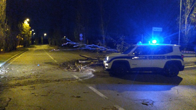 La polizia locale, a seguito dell’allerta arancione pervenuta nel pomeriggio di venerdì (che preannunciava venti tra 62-74 km/h) ha raddoppiato il numero dei suoi equipaggi del turno notturno per fare fronte all’eccezionale ondata di maltempo.