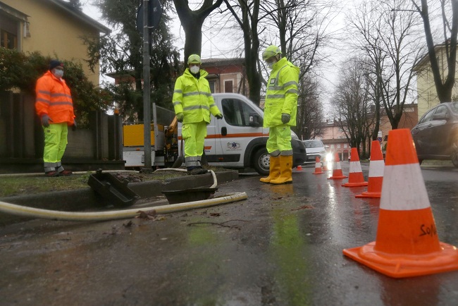 foto di Roberto Brancolini: operatori e volontari di Protezione civile al lavoro con famiglie e imprese a Nonantola