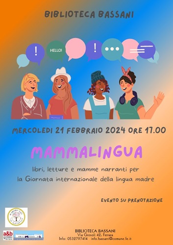 FERRARA – Un pomeriggio tra libri, letture e mamme narranti per celebrare la Giornata internazionale della lingua madre. L’appuntamento è per mercoledì 21 febbraio 2024 alle 17 alla biblioteca comunale Bassani di via Grosoli 42 (Barco, Ferrara), per un appuntamento speciale con “L’ora del racconto” tutto dedicato alla scoperta delle lingue del mondo