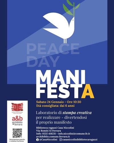 FERRARA – È pensato per bambine e bambini dai 6 anni il laboratorio di stampa creativa che sabato 24 gennaio 2026, alle 10:30, sarà ospitato dalla biblioteca comunale per ragazzi di Casa Niccolini (via Romiti 13, Ferrara). Nel corso dell’appuntamento, a cura di Elisa Vita, i piccoli partecipanti potranno sperimentare l’arte di creare, divertendosi, un manifesto come mezzo di comunicazione, di lettura immediata e di diffusione di temi importanti legati alla pace e alla libertà di pensiero e di stampa.
