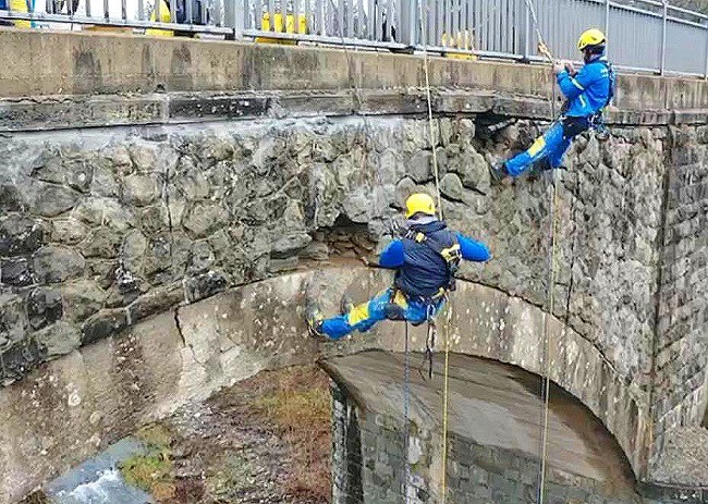 Nella foto: operatori di EdiliziAcrobatica al lavoro sul ponte di Merlotto