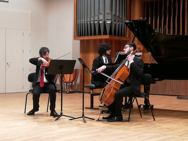 Spazio infine alla musica: sul palco è salito il Trio Gesualdo composto da Rosario Arena (violino), Paolo Miccolis (violoncello) e Raffaele Battiloro (pianoforte), per l’esecuzione – apprezzatissima da tutto il pubblico – di un programma all’insegna dell’Ottocento. Apertura con il Trio op. 1 n. 3 in do minore di L. V. Beethoven, di cui i tre giovani musicisti hanno reso con precisione ed efficacia il carattere intenso e drammatico. Altrettanto affascinante il Trio concertante op. 1 n. 1 in fa diesis minore di César Franck: slancio lirico unito a rigore, con attenzione alla costruzione tematica della composizione di cui i musicisti, con grande maturità interpretativa, hanno sottolineato gli aspetti formali più interessanti. Acclamati dagli applausi, i tre giovani talenti del Conservatorio potentino hanno infine eseguito il bis.